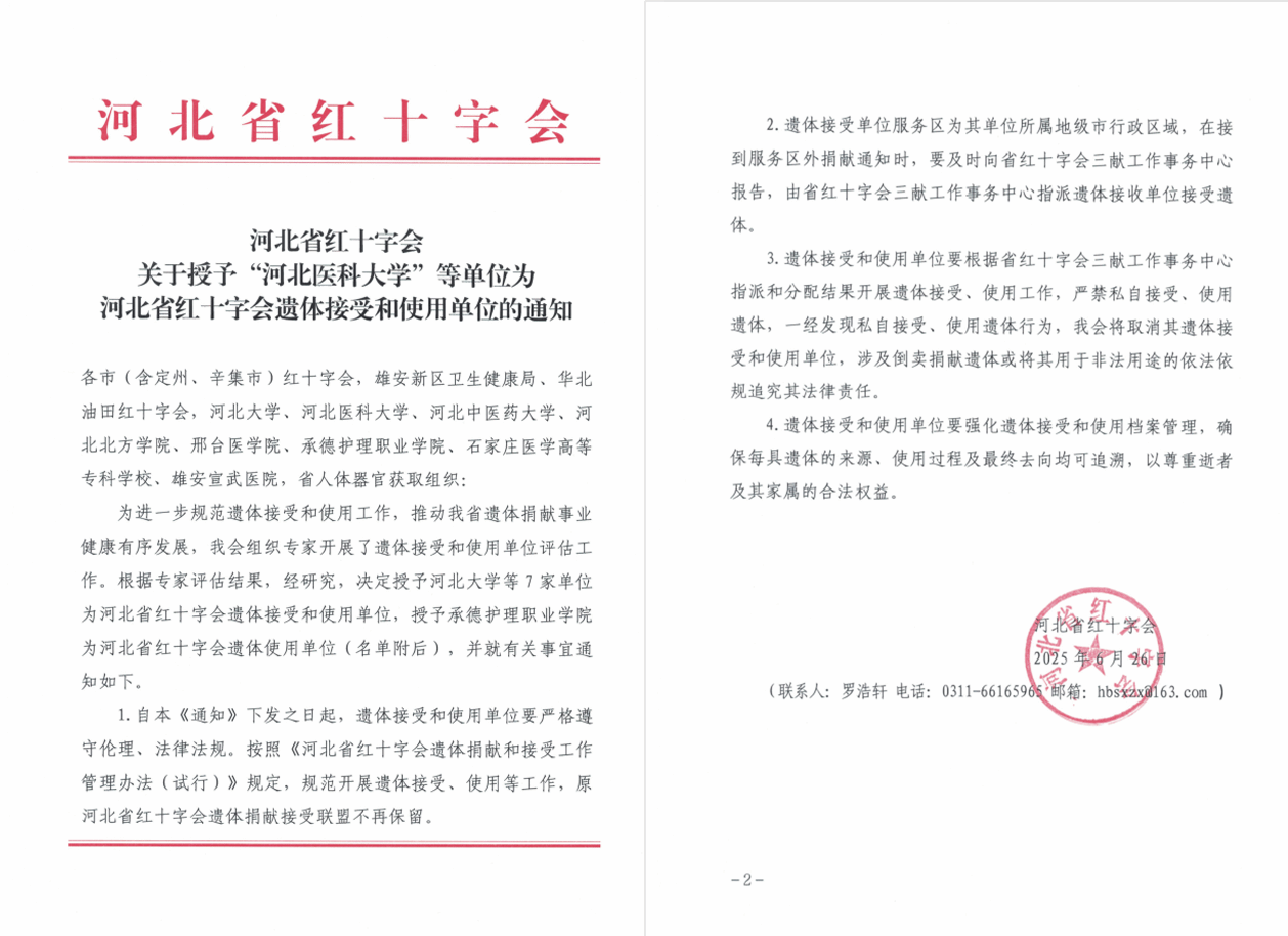 近日,万象城官网获批“河北省红十字会遗体接受和使用单位”,成为全市首个具备专业资质的遗体捐献接受机构,对促进全市医学教育发展、科研水平提升及临床技术进步具有重要意义。