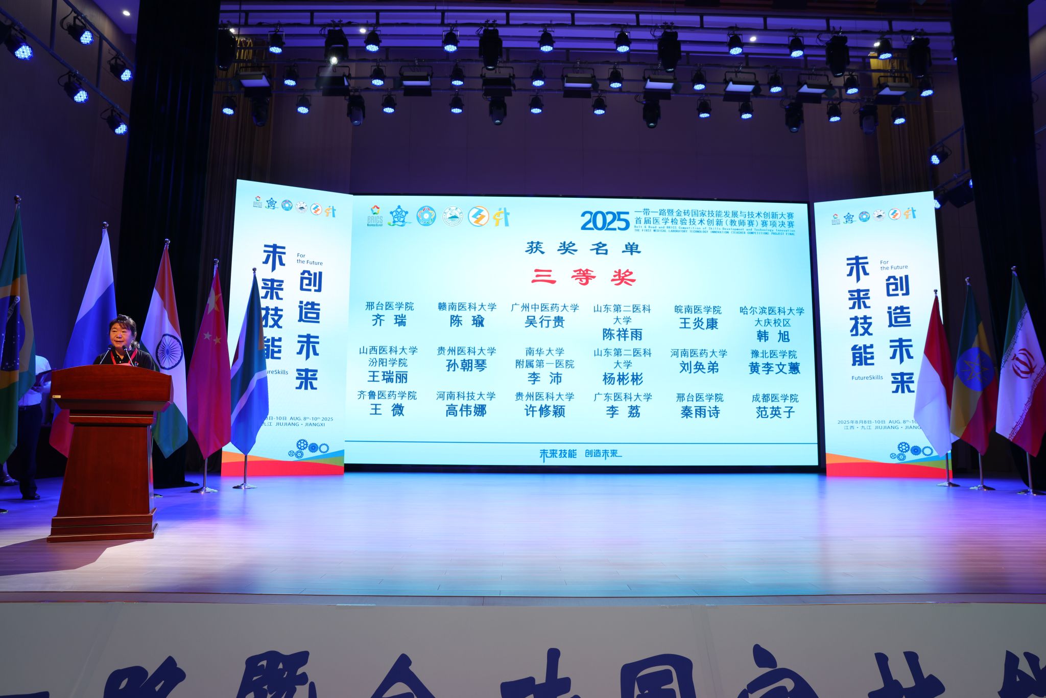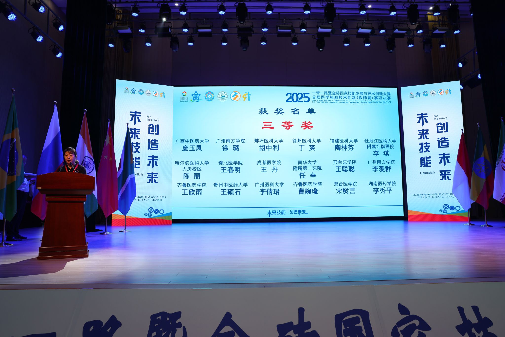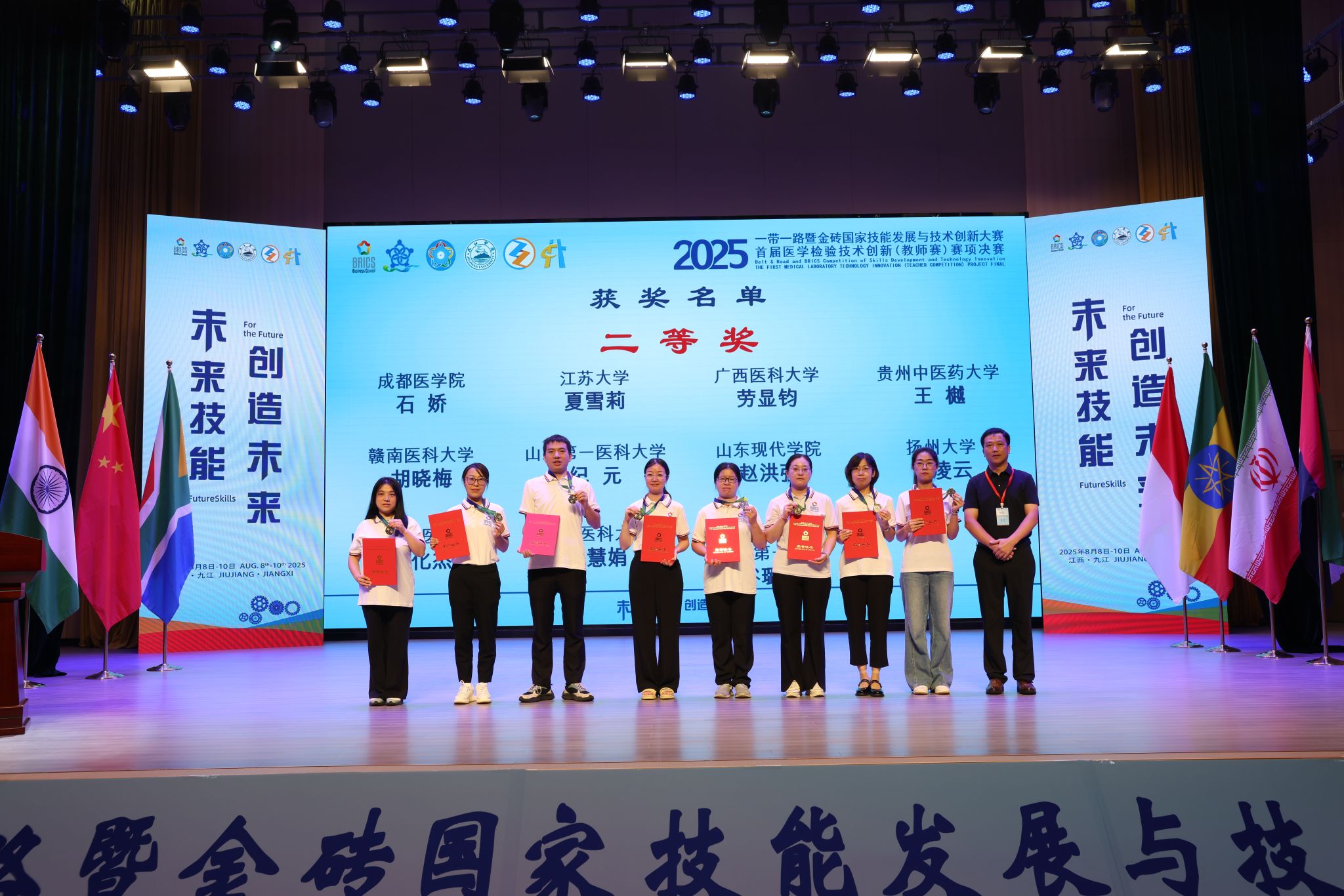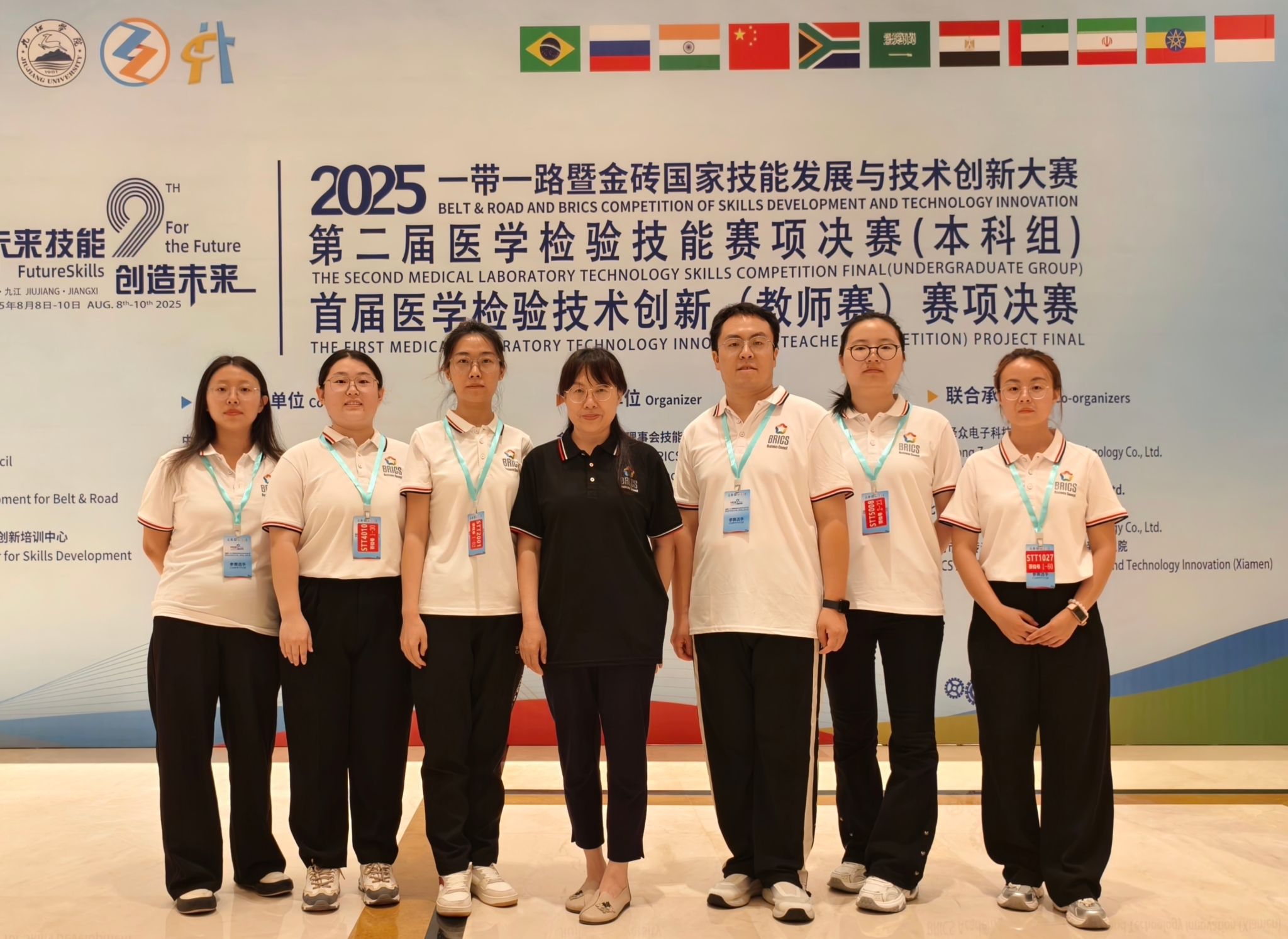 近日,由教育部主办、九江学院承办的2025“一带一路”暨金砖国家技能发展与技术创新大赛落下帷幕。万象城官网医疗技术系王若潼、张笑笑、宋树言、齐瑞、王聪聪、秦雨诗6名教师在医学检验技术创新赛项中,凭借扎实的专业功底与创新实践能力,斩获二等奖1项、三等奖5项,学校荣获“优秀组织奖”。