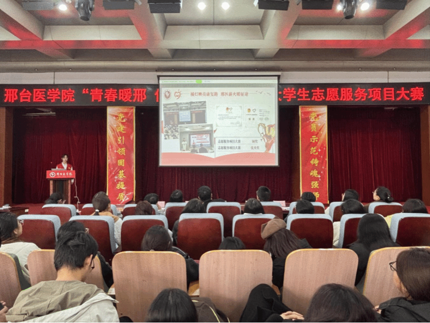 比赛现场,7个团队围绕社区治理、为老服务、卫生健康、阳光助残等主题展开比拼。临床医学系团总支“助力社区治理,传递爱与温暖”志愿服务项目深入基层、主动作为,开展社区服务与环保宣传等志愿服务活动20余次,服务群众上千人次。护理系团总支“桑榆情 赤子心”志愿服务项目聚焦老龄化需求,深入养老院与乡村为老人提供生活照料、专业照护等多元服务,一年来累计开展志愿服务活动21次,服务时长1379小时,服务老人521人次。口腔医学系团总支“志愿同行,医路成长”志愿服务项目立足专业所学、服务群众所需,积极开展口腔义诊、爱牙宣教志愿服务活动,传递健康关怀,彰显了青年学子的责任担当。医疗技术系团总支“‘睛’彩守护,志愿‘瞳’行”志愿服务项目围绕青少年眼健康,积极开展科普活动与视力筛查,一年来累计服务5000余人次。药学系团总支“药护民生,科普护航”志愿服务项目深耕校园与社区,积极开展用药指导、科普宣讲及过期药回收服务,项目惠及500余人,让安全用药理念走进千家万户。中医系团总支“橘灯暖特教,星火传童心”志愿服务项目以专业传递温暖,以爱心点亮童心,先后300余名志愿者通过常态化服务与专项培训精准对接特殊儿童需求,接力开展粘土创作、音乐节互动等特色活动,展现了新时代青年的奉献精神。大学生小橘灯助残协会“橘灯映亮康复路 邢医薪火暖征途”志愿服务项目构建专业服务体系,一年来累计开展康复、心理陪伴、社会融入等志愿服务活动17次,服务时长1564小时,帮助残障老人和儿童867名。