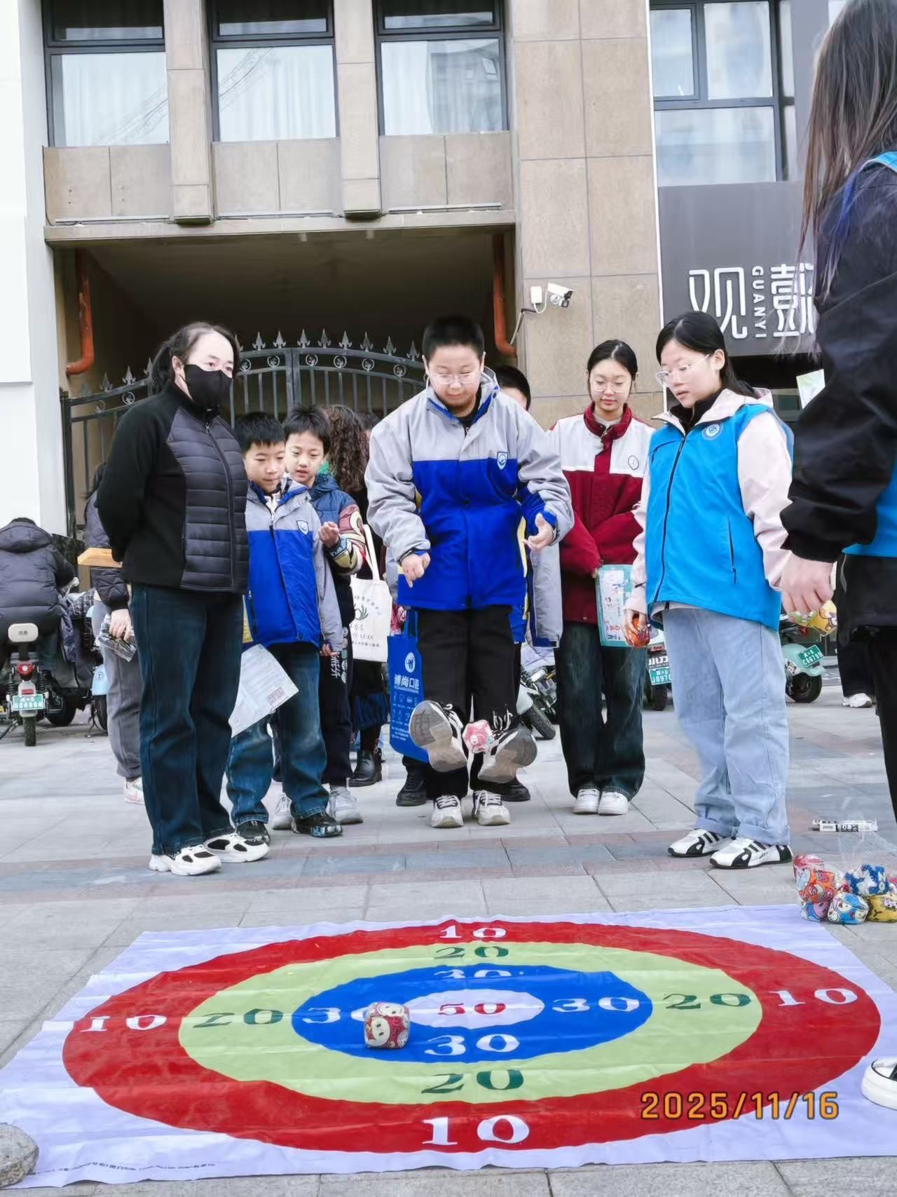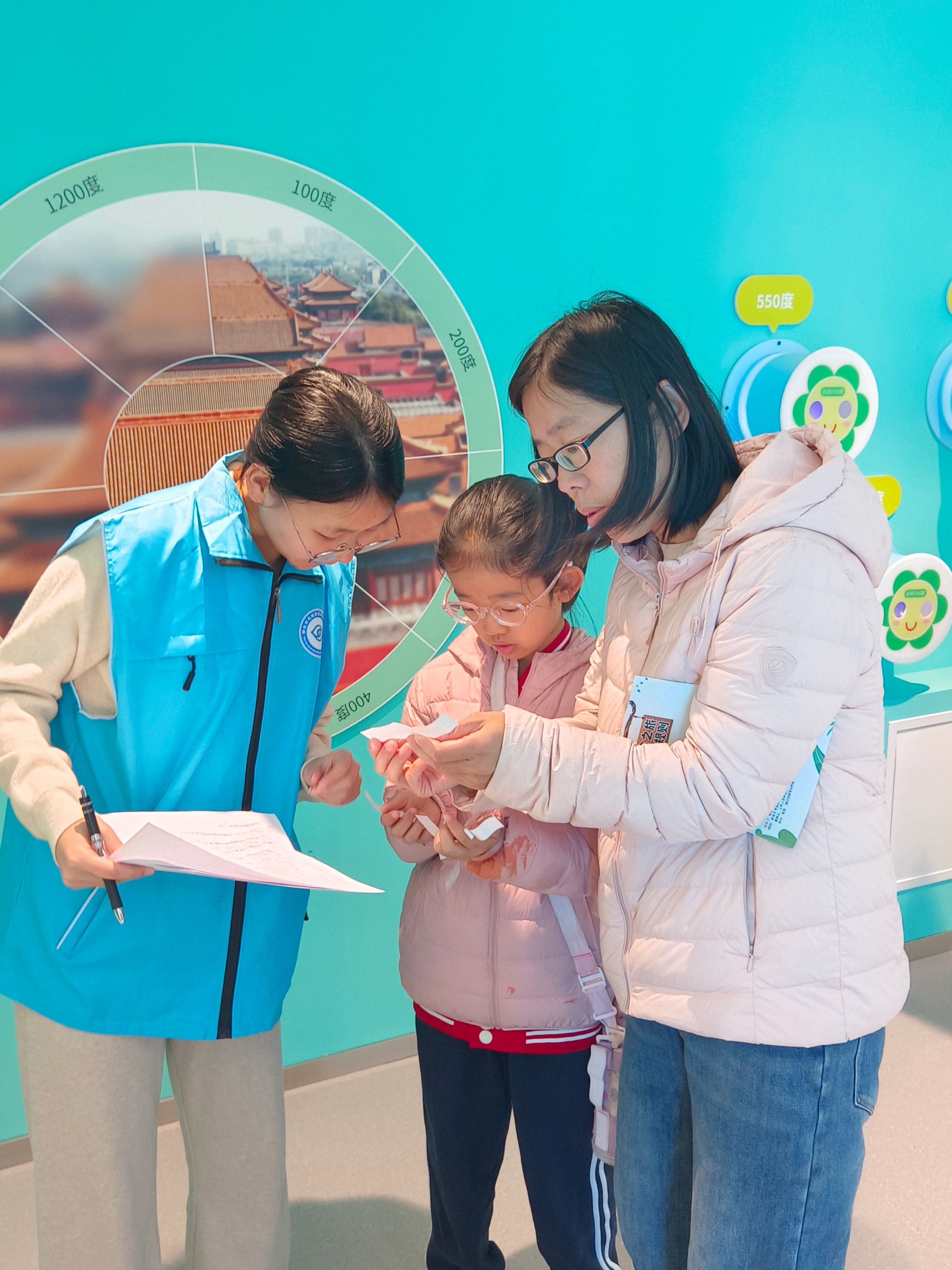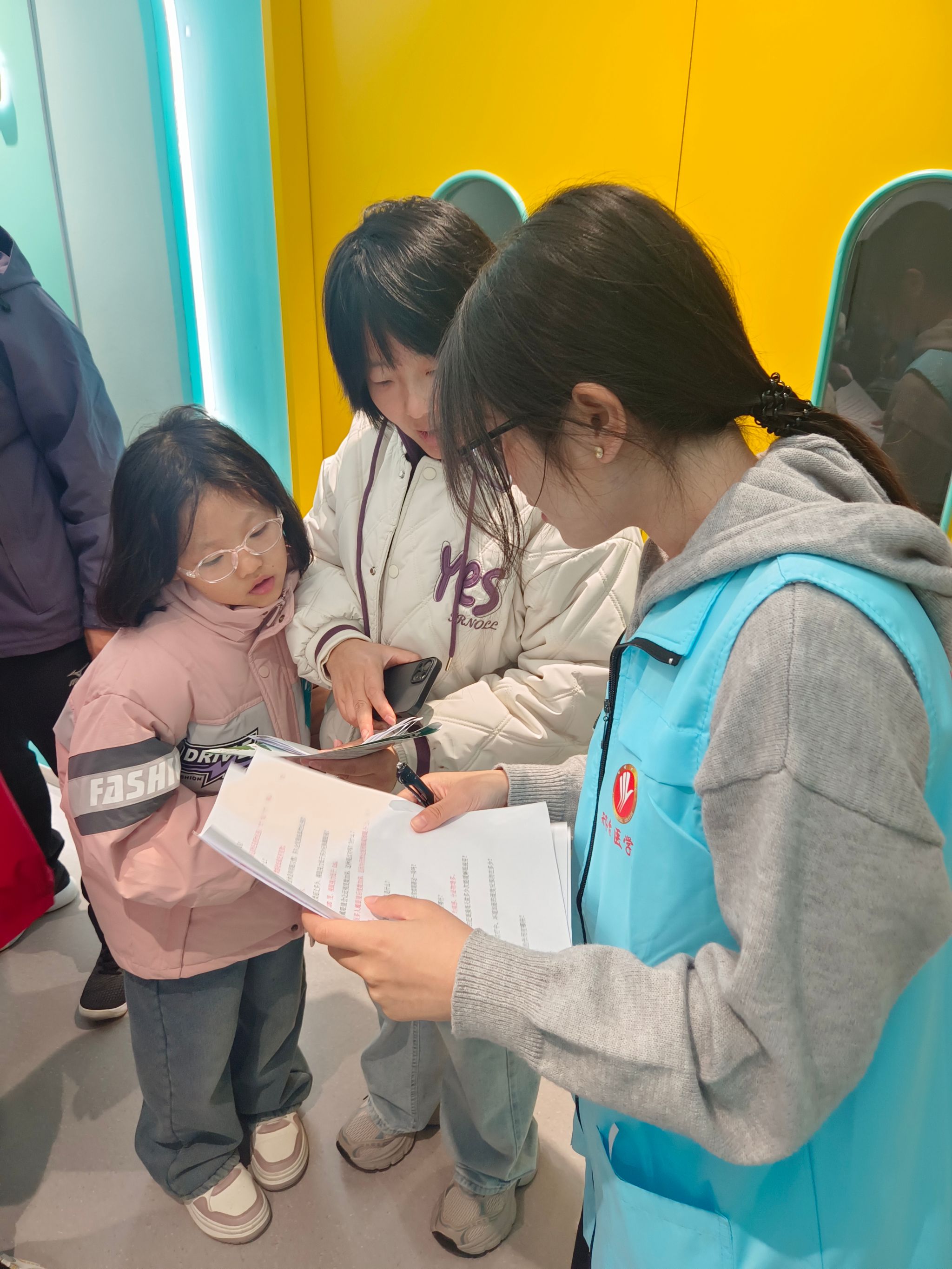 活动中,宣讲团志愿者充分发挥专业特长,积极投入现场组织与科普教育工作。在动态视力挑战区,他们通过“投壶”“沙包靶盘”等互动游戏,指导孩子们掌握动作要领,并向家长宣传“动静结合”的护眼理念。在静态科普区,他们将近视预防、用眼卫生等知识巧妙融入“护眼灯谜”活动,以问答形式激发亲子家庭的参与热情。在协作信任体验区,他们通过“蒙眼指挥”“高处观图”等项目,帮助家长与孩子直观认识视力健康的重要性。志愿者还在科普馆内开展深入浅出的讲解,将专业知识转化为通俗语言,有效提升了亲子家庭对视力保护的认知水平与重视程度。
