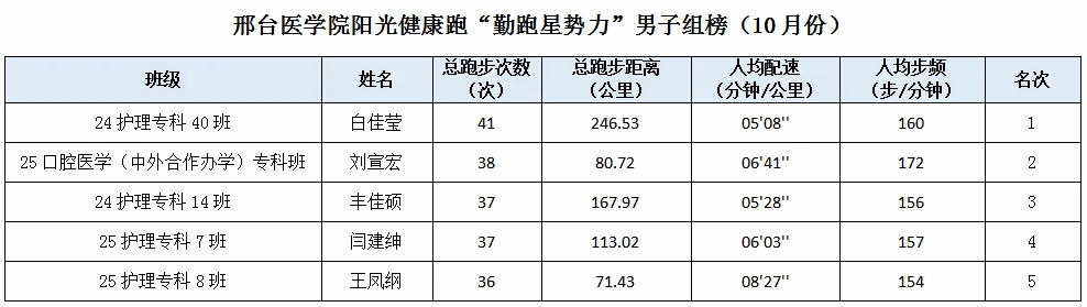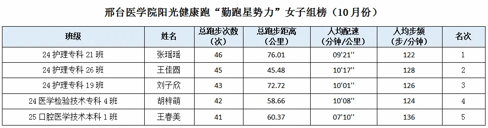 评比活动以跑步次数及累计里程为评价指标,经严格审核,分别产生了10月份男女组的前五名。同学们纷纷表示,通过跑步不仅收获了健康,更在挥洒汗水过程中结识了志同道合的运动伙伴,体会到运动的乐趣。