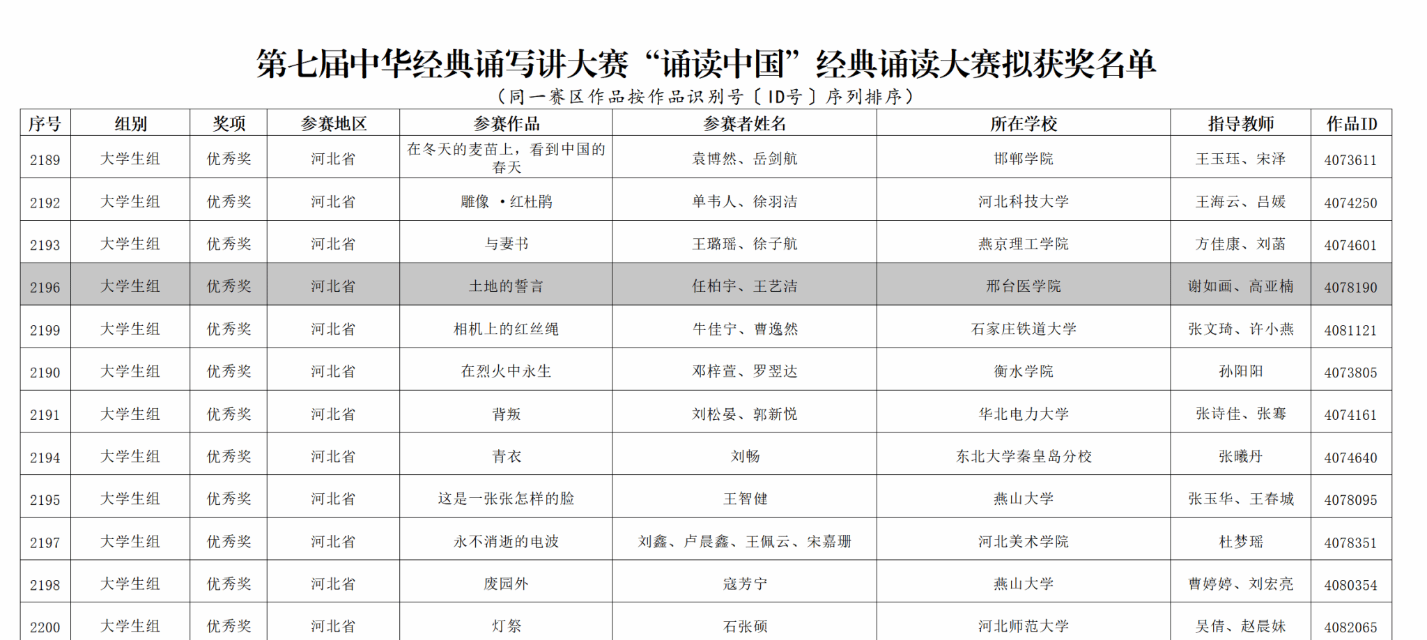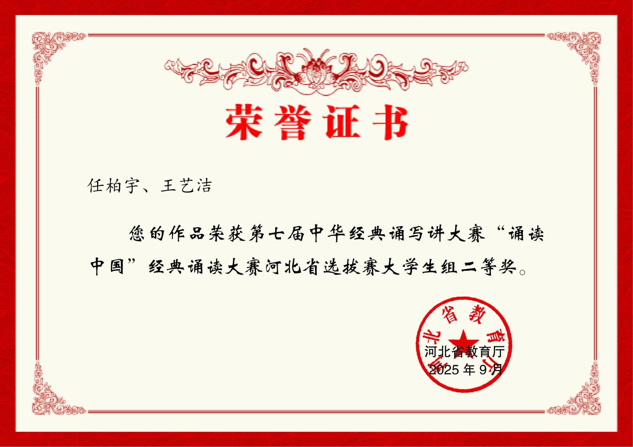 近日,第七届中华经典诵写讲大赛获奖名单公布,万象城官网学生在比赛中表现优异。2024级装备1班任柏宇、2024级临床7班王艺洁同学的作品《土地的誓言》荣获全国优秀奖。4名师生荣获省赛二等奖1项、三等奖2项。