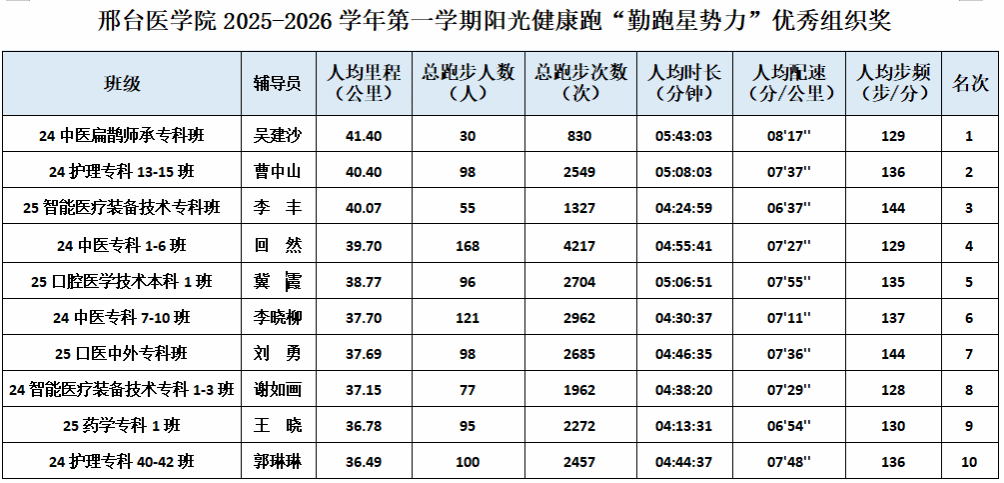 活动贯穿整个学期,设置个人赛与班级团体赛两个赛道,个人赛以打卡次数为首要排名标准,拼的是持之以恒;团体赛以人均里程分胜负,拼的是同心协力。清晨微光里、绿树林荫下、塑胶跑道上,随处可见同学们奔跑的身影,构成了校园一道靓丽的风景线。经审核,最终评选出个人赛男、女组每月前5名、学期前10名,以及优秀组织奖10个(班级)。