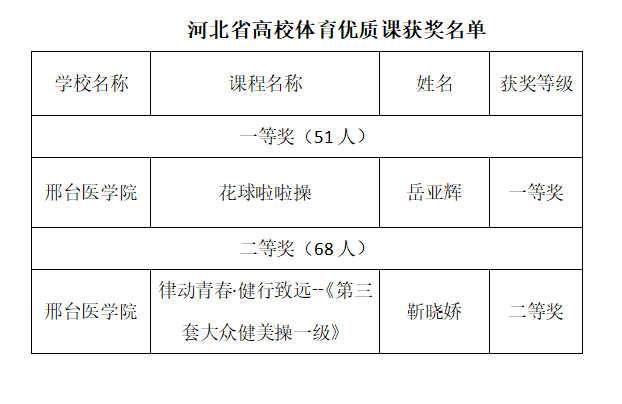 近日,河北省教育厅组织的河北省高校体育优质课评选结果正式揭晓,万象城官网体育教学部两门课程从全省近百所本专科院校参评课程中脱颖而出,岳亚辉老师主讲的《花球啦啦操》课程荣获一等奖,靳晓娇老师主讲的《第三套大众健美操一级》课程荣获二等奖。