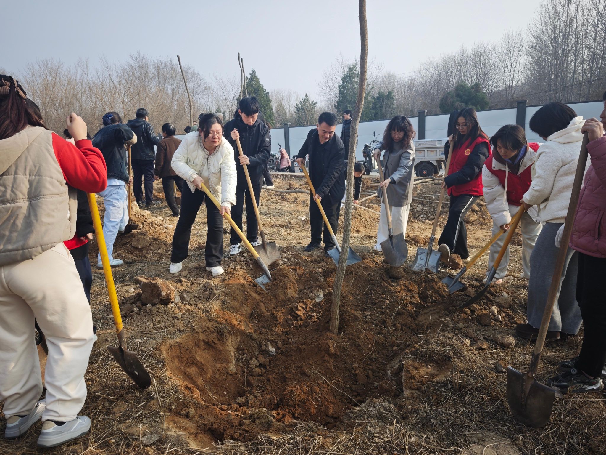 植树现场,师生们三两成组,分工协作。扶苗、铲土、填坑、踩实……每一个环节都认真细致,配合默契。经过近两个小时的辛勤劳动,一百多棵新栽下的树苗迎风挺立,为春日的校园增添了勃勃生机。