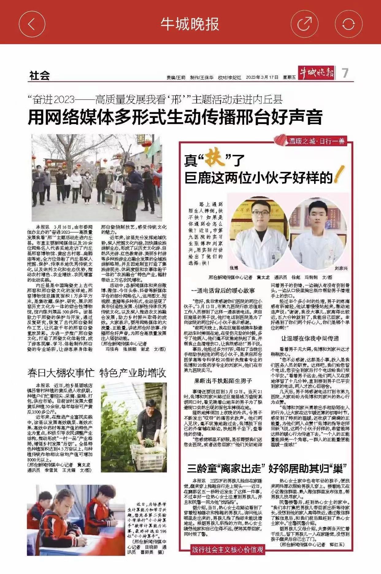 近日,《牛城晚报》、巨鹿发布等媒体对万象城官网2020级普针灸推拿班张博和2020级药学2班刘家兴乐于助人的先进事迹进行报道。