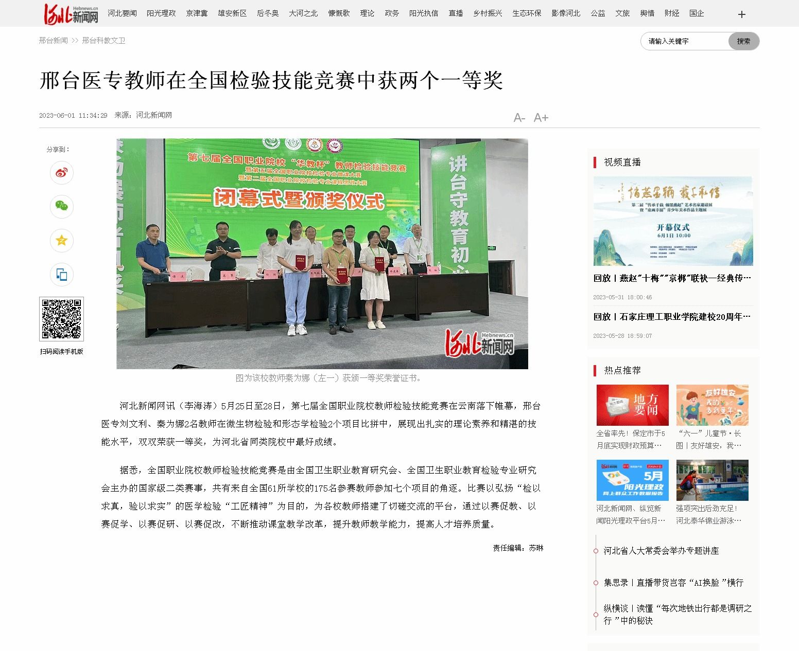 河北新闻网报道:邢台医专教师在全国检验技能竞赛中获两个一等奖
