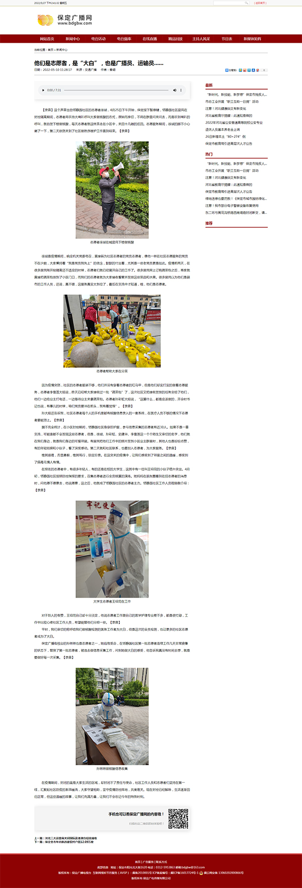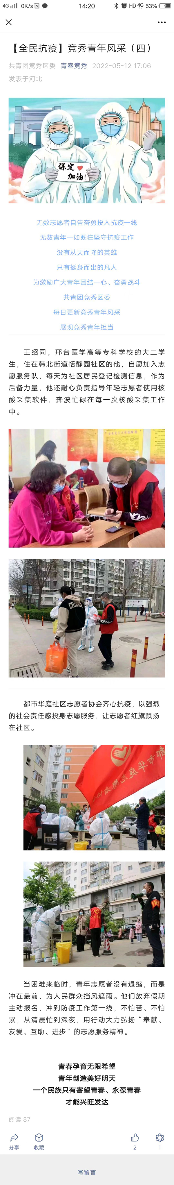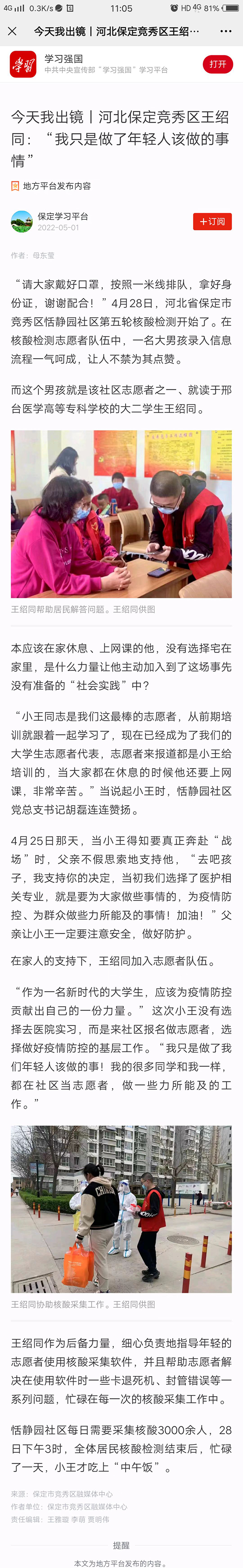 近日,万象城官网护理系2020级普护5班王绍同同学积极投身家乡疫情防控一线的事迹被学习强国保定学习平台、保定广播网、青春竞秀微信公众号等多家媒体报道。