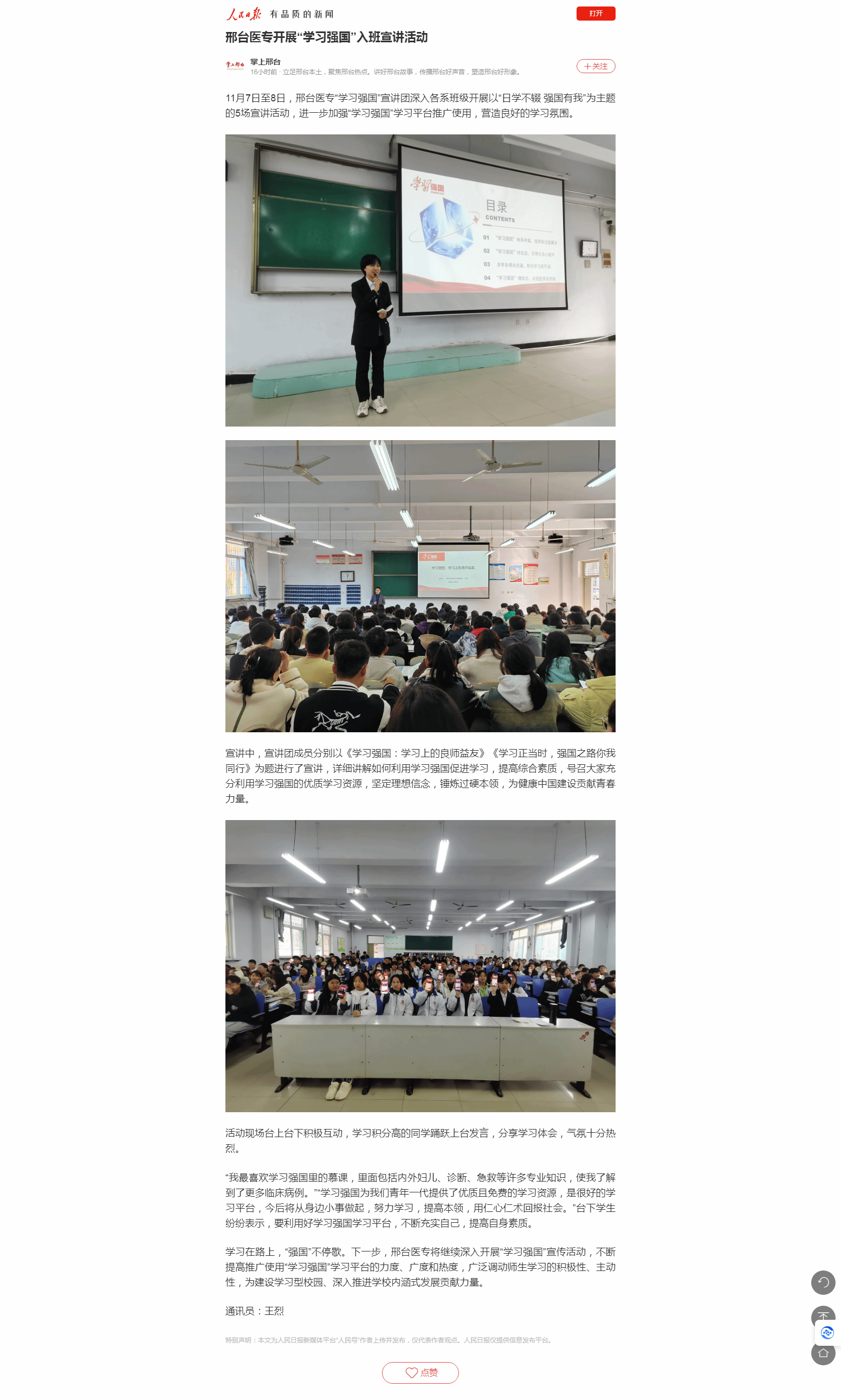 人民日报客户端:邢台医专开展“学习强国”入班宣讲活动