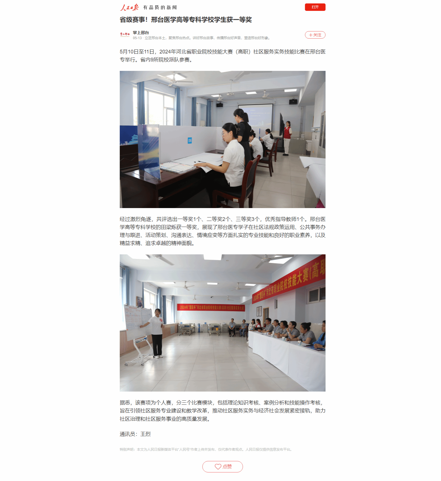 人民日报客户端:省级赛事!邢台医学高等专科学校学生获一等奖