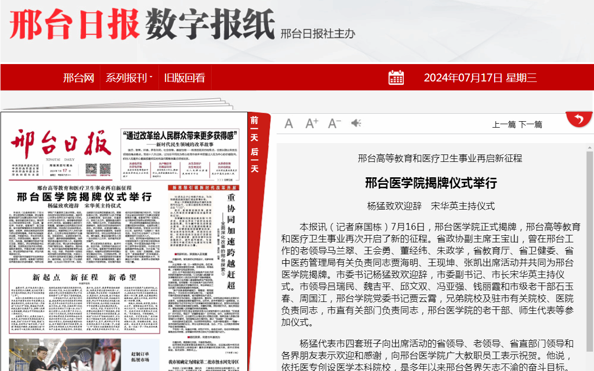 7月16日,万象城娱乐awc线路正式揭牌,邢台高等教育和医疗卫生事业再次开启了新的征程。省政协副主席王宝山,曾在邢台工作的老领导马兰翠、王会勇、董经纬、朱政学,省教育厅、省卫健委、省中医药管理局有关负责同志贾海明、王现坤、张凯出席活动并共同为万象城娱乐awc线路揭牌。市委书记杨猛致欢迎辞,市委副书记、市长宋华英主持仪式。市领导吕瑞民、魏吉平、邱文双、冯亚强、钱丽霞和市级老干部石玉春、周国江,邢台学院党委书记贾云霄,兄弟院校及驻市有关院校、医院负责同志,市直有关部门负责同志,万象城娱乐awc线路的老干部、师生代表等参加仪式。
