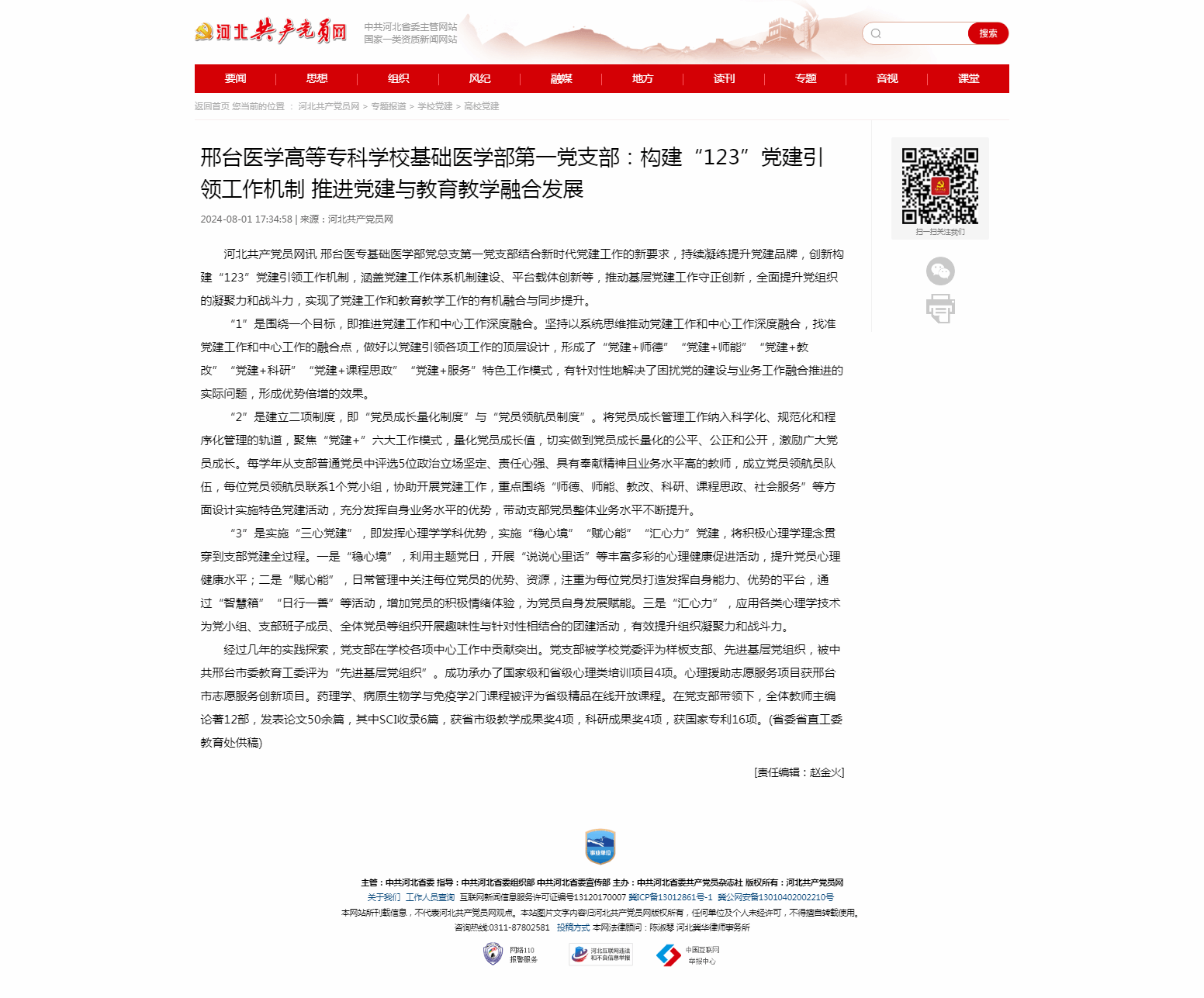河北共产党员网:邢台医学高等专科学校基础医学部第一党支部:构建“123”党建引领工作机制 推进党建与教育教学融合发展