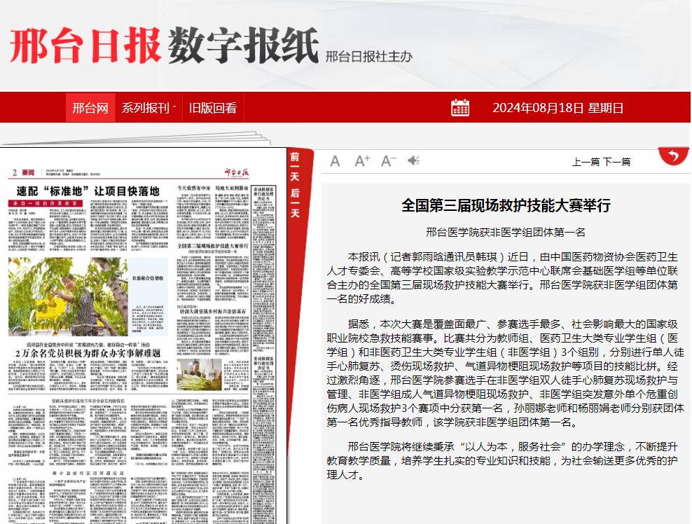 据悉,本次大赛是覆盖面最广、参赛选手最多、社会影响最大的国家级职业院校急救技能赛事。比赛共分为教师组、医药卫生大类专业学生组(医学组)和非医药卫生大类专业学生组(非医学组)3个组别,分别进行单人徒手心肺复苏、烫伤现场救护、气道异物梗阻现场救护等项目的技能比拼。经过激烈角逐,万象城娱乐awc线路参赛选手在非医学组双人徒手心肺复苏现场救护与管理、非医学组成人气道异物梗阻现场救护、非医学组突发意外单个危重创伤病人现场救护3个赛项中分获第一名,孙丽娜老师和杨丽娟老师分别获团体第一名优秀指导教师,该学院获非医学组团体第一名。