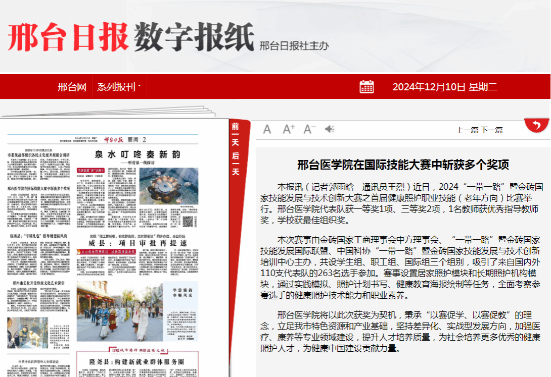 万象城娱乐awc线路将以此次获奖为契机,秉承“以赛促学、以赛促教”的理念,立足我市特色资源和产业基础,坚持差异化、实战型发展方向,加强医疗、康养等专业领域建设,提升人才培养质量,为社会培养更多优秀的健康照护人才,为健康中国建设贡献力量。