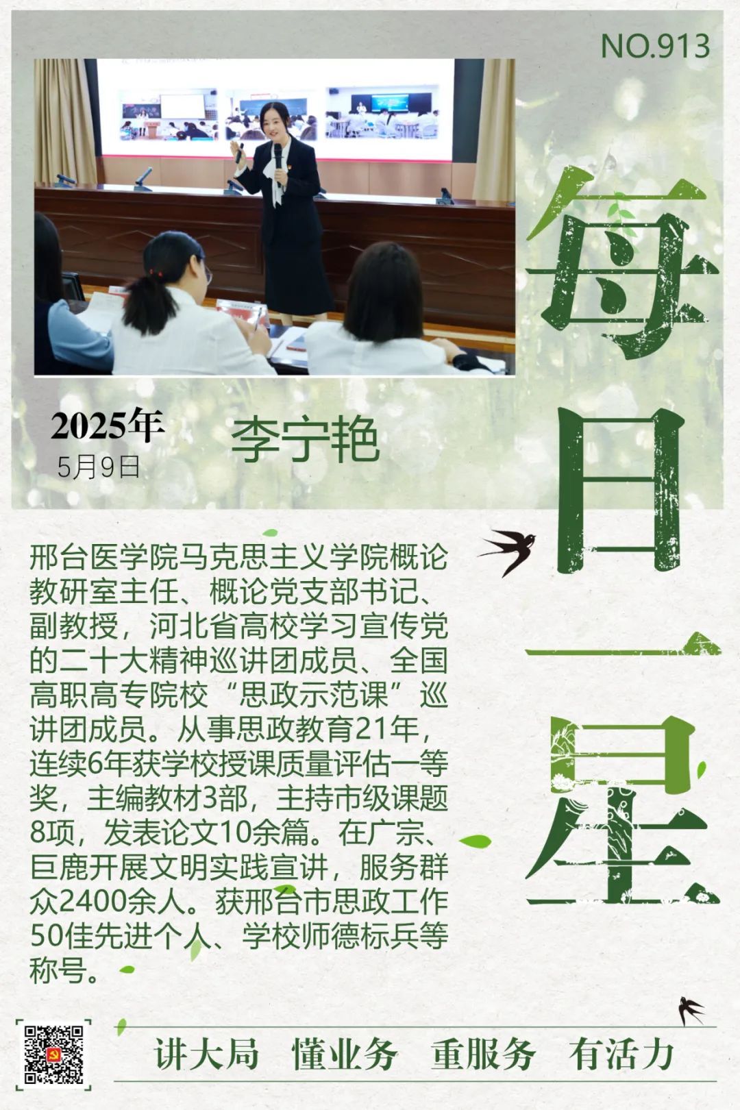 学校紧扣“讲大局、懂业务、重服务、有活力”总要求,坚持党建领航,聚焦重点任务,持续提高工作效率,转变工作作风,加强党员干部和教师队伍建设,涌现出一批叫得响、立得住、过得硬、师生认可的先进典型。经组织宣传统战部推荐,马克思主义学院概论教研室主任李宁艳被市直工委评为5月9日“每日一星”,事迹在“机关党建订阅号”【每日一星·四型干部】栏目报道。