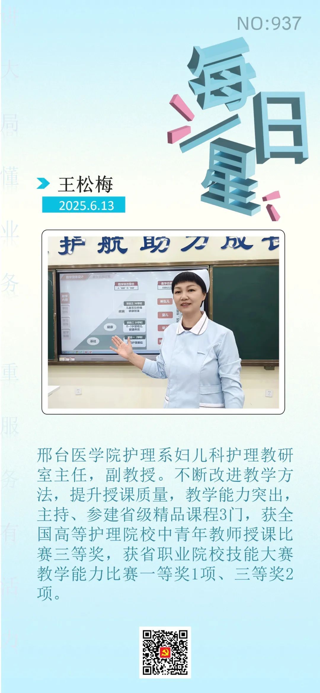 学校紧扣“讲大局、懂业务、重服务、有活力”总要求,坚持党建领航,聚焦重点任务,持续提高工作效率,转变工作作风,加强党员干部和教师队伍建设,涌现出一批叫得响、立得住、过得硬、师生认可的先进典型。经组织宣传统战部推荐,护理系妇儿科护理教研室主任王松梅被市直工委评为6月13日“每日一星”,事迹在“机关党建订阅号”【每日一星·四型干部】栏目报道。