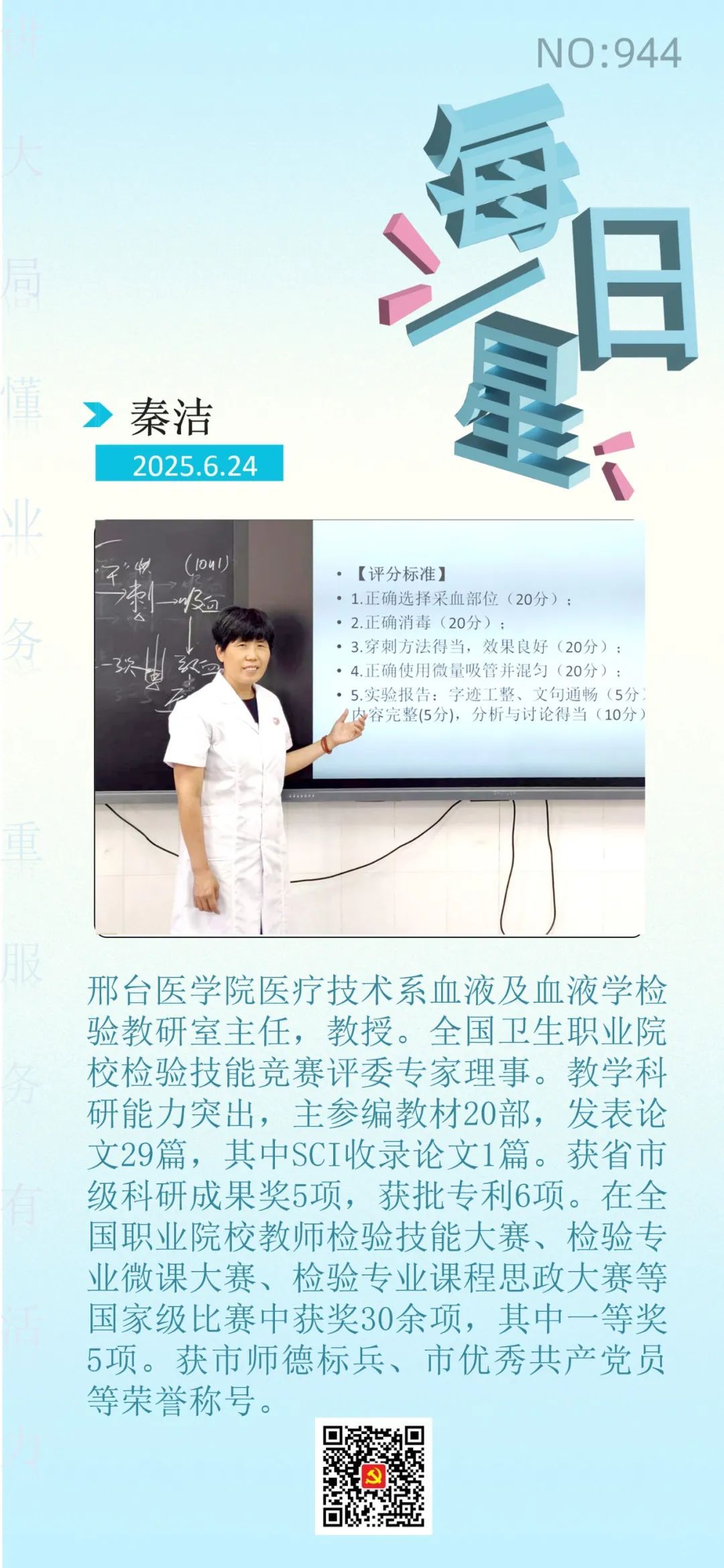 学校紧扣“讲大局、懂业务、重服务、有活力”总要求,坚持党建领航,聚焦重点任务,持续提高工作效率,转变工作作风,加强党员干部和教师队伍建设,涌现出一批叫得响、立得住、过得硬、师生认可的先进典型。经组织宣传统战部推荐,医疗技术系血液及血液学检验教研室主任秦洁被市直工委评为6月24日“每日一星”,事迹在“机关党建订阅号”【每日一星·四型干部】栏目报道。