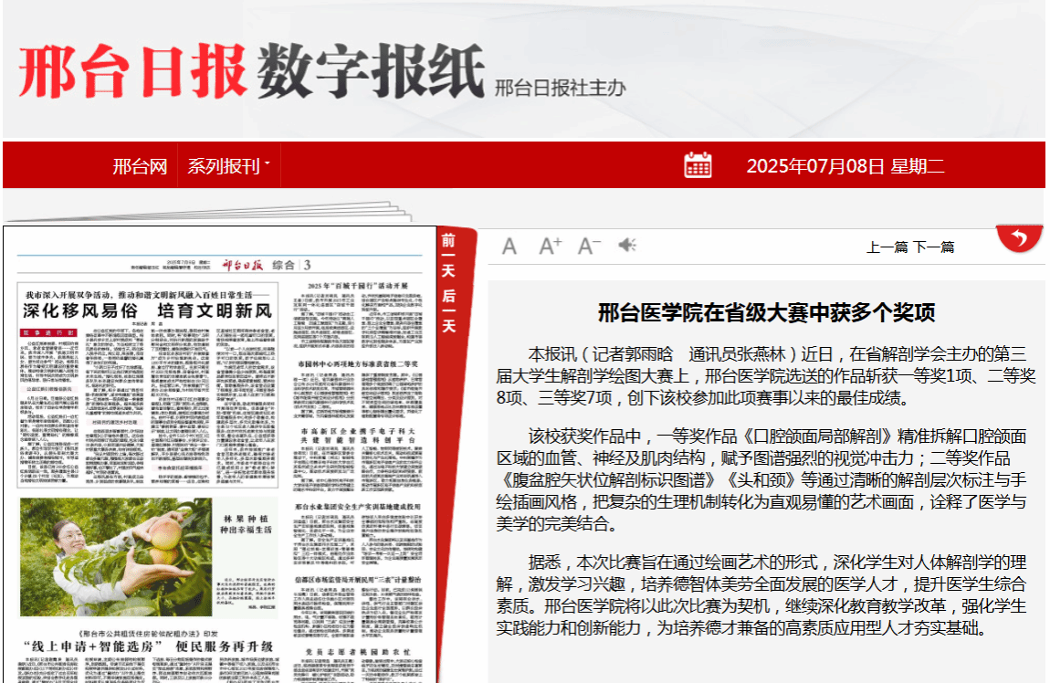 该校获奖作品中,一等奖作品《口腔颌面局部解剖》精准拆解口腔颌面区域的血管、神经及肌肉结构,赋予图谱强烈的视觉冲击力;二等奖作品《腹盆腔矢状位解剖标识图谱》《头和颈》等通过清晰的解剖层次标注与手绘插画风格,把复杂的生理机制转化为直观易懂的艺术画面,诠释了医学与美学的完美结合。