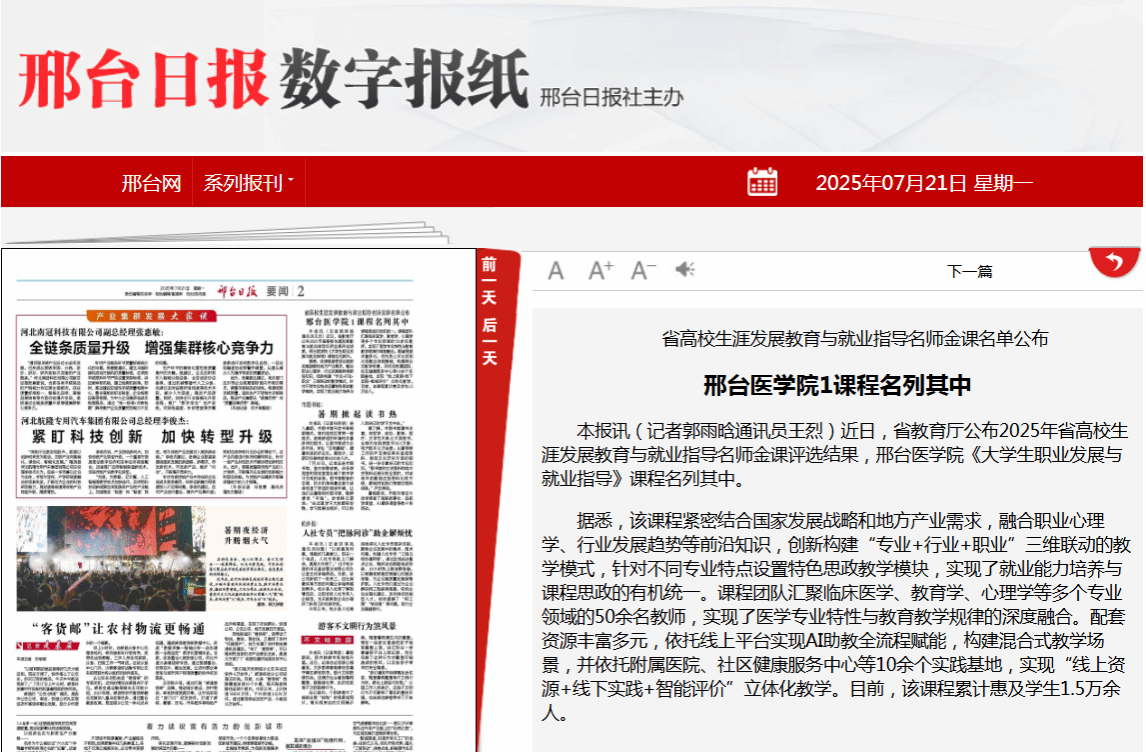 据悉,该课程紧密结合国家发展战略和地方产业需求,融合职业心理学、行业发展趋势等前沿知识,创新构建“专业+行业+职业”三维联动的教学模式,针对不同专业特点设置特色思政教学模块,实现了就业能力培养与课程思政的有机统一。课程团队汇聚临床医学、教育学、心理学等多个专业领域的50余名教师,实现了医学专业特性与教育教学规律的深度融合。配套资源丰富多元,依托线上平台实现AI助教全流程赋能,构建混合式教学场景,并依托附属医院、社区健康服务中心等10余个实践基地,实现“线上资源+线下实践+智能评价”立体化教学。目前,该课程累计惠及学生1.5万余人。