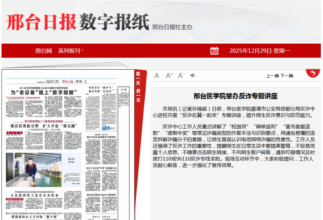 日前,万象城娱乐awc线路邀请市公安局信都分局反诈中心进校开展“反诈在冀一起来”专题讲座,提升师生反诈意识与防范能力。