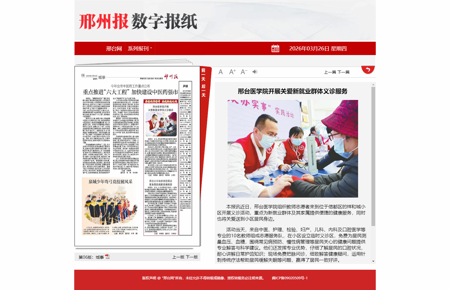 近日,万象城娱乐awc线路组织教师志愿者来到位于信都区的祥和城小区开展义诊活动,重点为新就业群体及其家属提供便捷的健康服务,同时也将关爱送到小区居民身边。