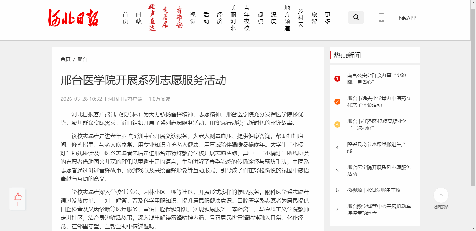 该校志愿者走进老年养护实训中心开展义诊服务,为老人测量血压、提供健康咨询,帮助打扫房间、修剪指甲,与老人唠家常,用专业知识守护老人健康,用真诚陪伴温暖桑榆晚年。大学生“小橘灯”助残协会及中医系志愿者先后走进邢台市特殊教育学校开展志愿活动,其中,“小橘灯”助残协会的志愿者借助图文并茂的PPT,以童趣十足的语言,生动讲解了春季流感的传播途径与预防手法;中医系志愿者通过讲述雷锋故事、做游戏以及共绘雷锋形象等互动形式,引导孩子们在轻松愉悦的氛围中感悟奉献与互助的意义。