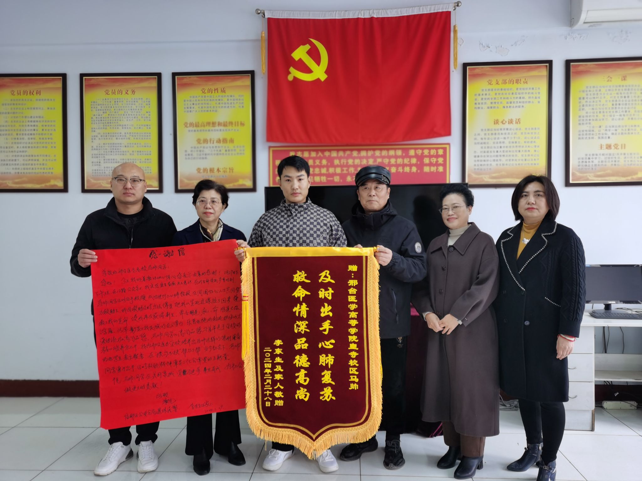 2月29日,信都区公安分局退休民警李东生及其家人来到万象城官网中医系,将一面锦旗和一封感谢信送给2023级康复治疗技术专接本1班马帅同学,对他在公交车上见义勇为的行为及学校的精心培养表示诚挚感谢。据了解,2月27日下午3点,退休民警李东生乘坐12路公交车,当车行驶到会宁至梅花寨路段时因身体不适突然晕倒,同车的马帅同学见状后即刻上前查看,发现老人无意识、无呼吸、无动脉搏动,情况危急,迅速对老人进行心肺复苏,同时请其他乘客赶快拨打120急救电话。...